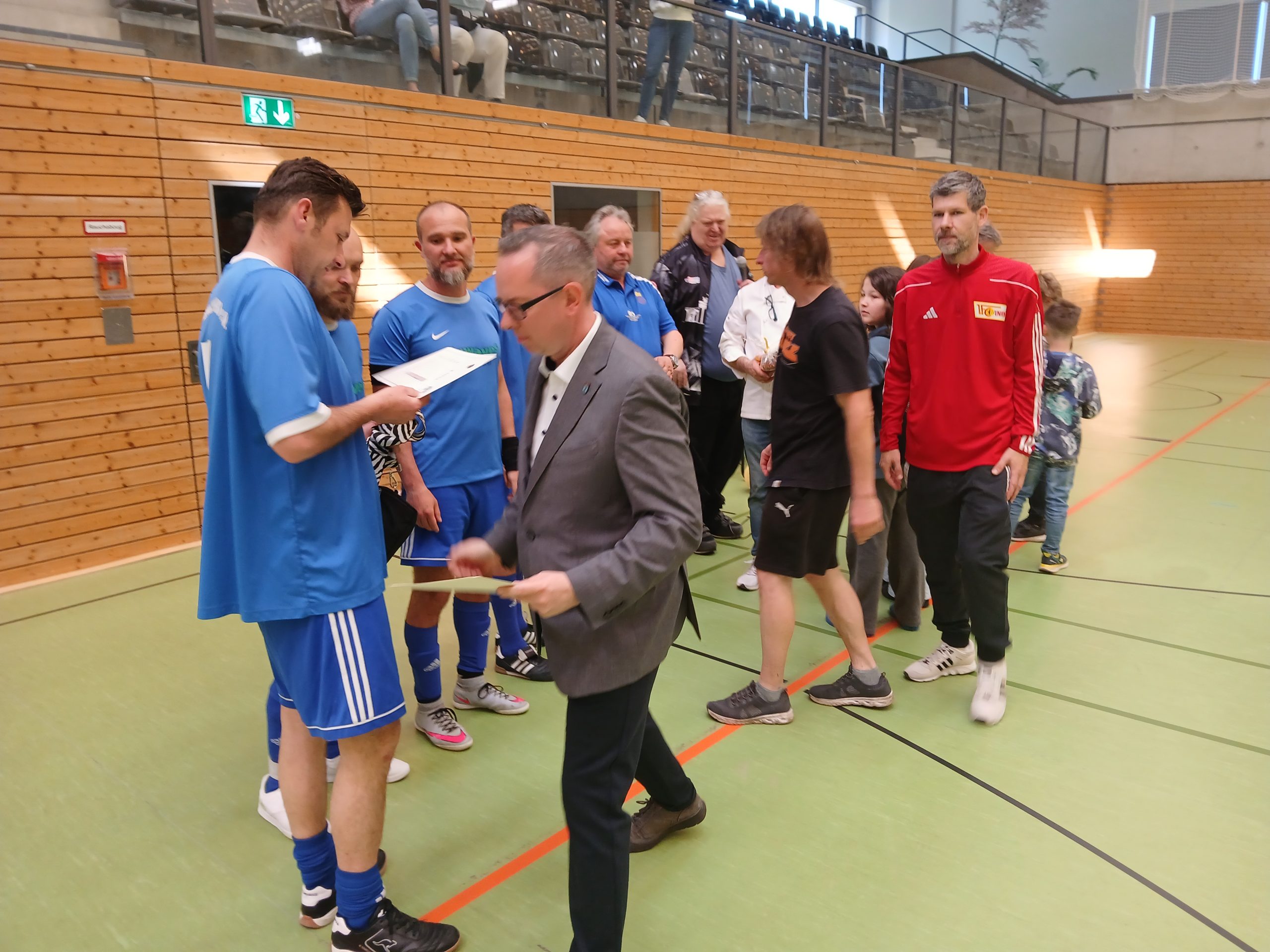 Danach entwickelt sich beim Spielstand 4:3 pro Italia bis kurz vor Abpfiff ein sehr munteres Ringen, Stirn an Stirn. Italia kann 5fach von der Bank nachlegen und versucht den KSV zu zermürben. Die furiosen 7 des KSV denken aber gar nicht an Aufgabe, spielen vielmehr munter auf und haben sogar die deutlichen besseren Chancen. Sie finden aber im gegnerischen Keeper ihren Meister und auch im Schiri… Die Verweise auf seine 2. Liga Schirikarriere unterlegt er leider nicht mit Leistung. Kurz nachdem Mario das 3:4 macht, wird er kurz vor dem Tor vom stürzenden Verteidiger per Hand von den Beinen geholt. Pfiff? Nö!