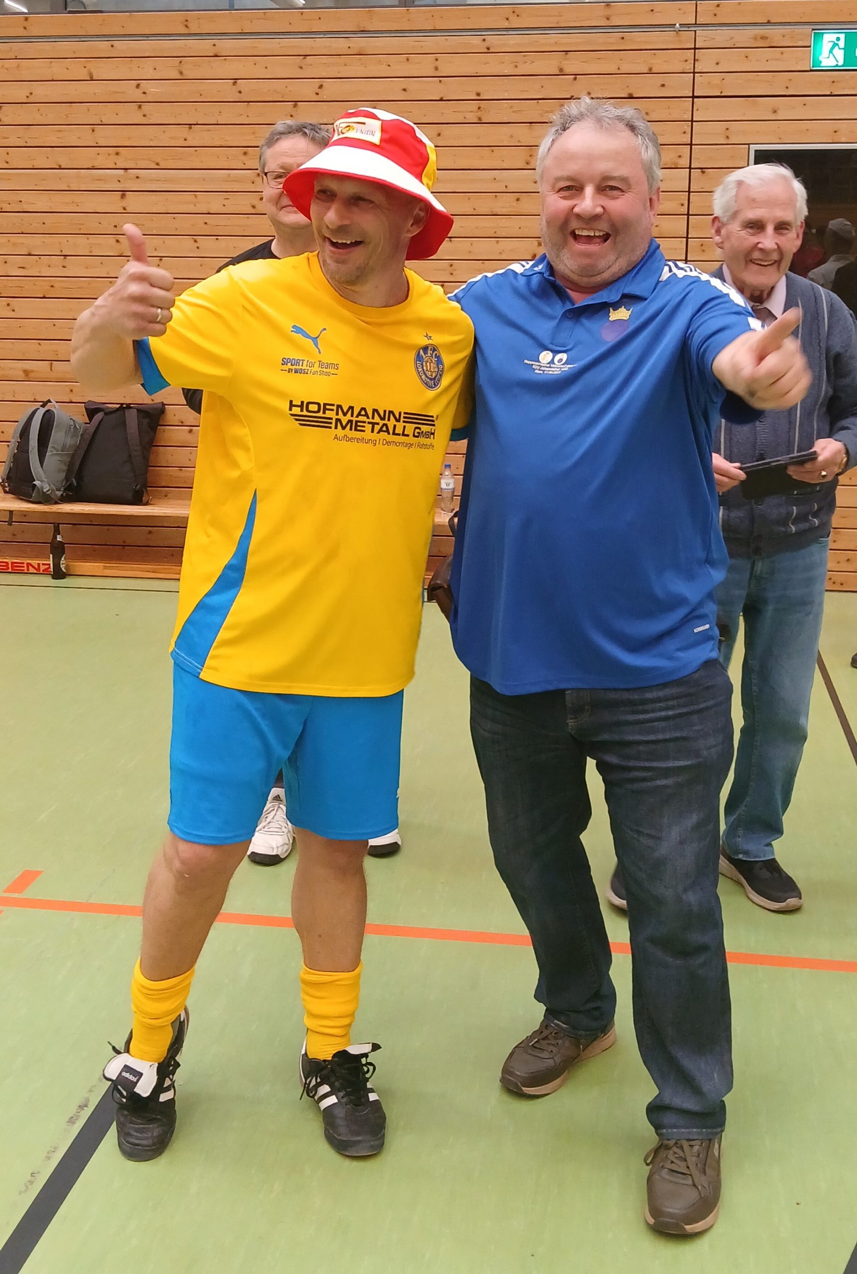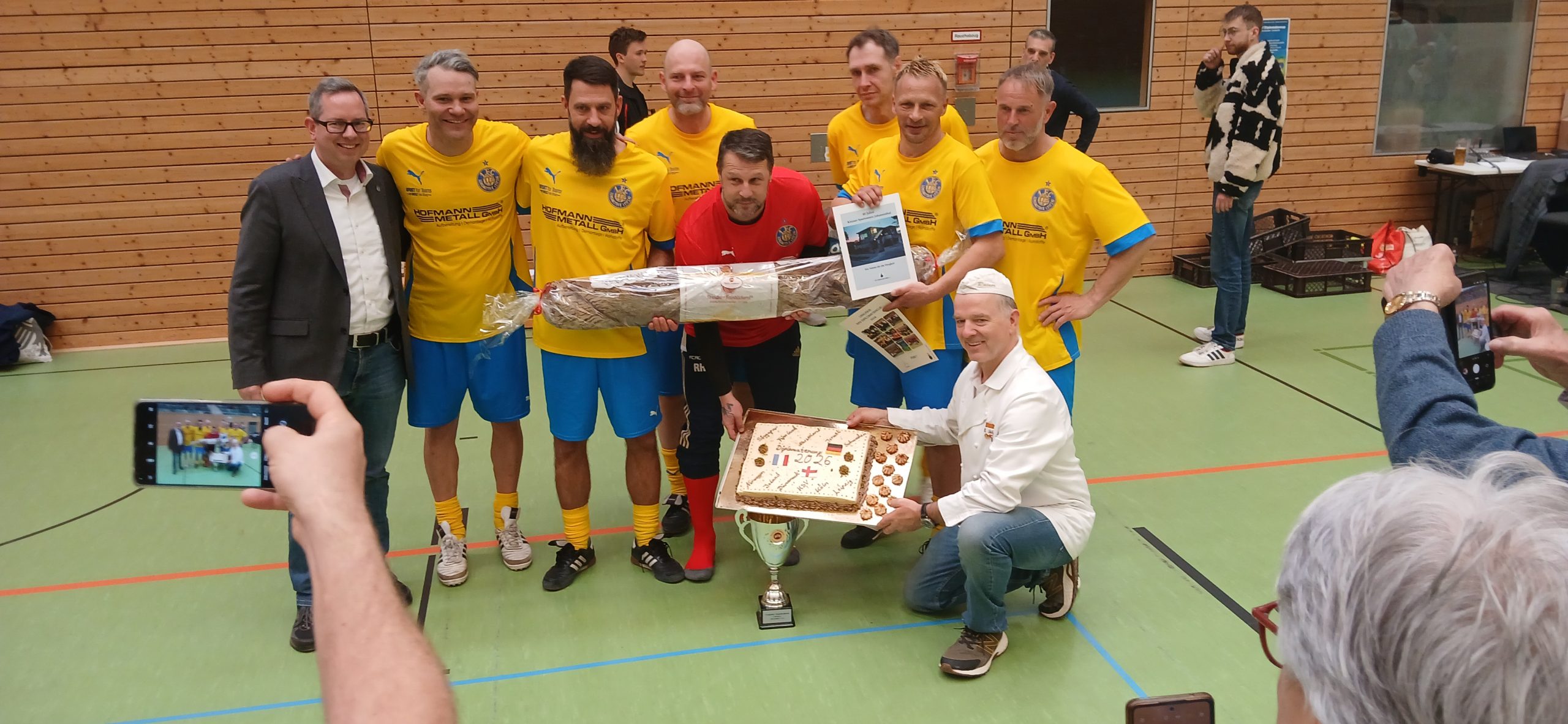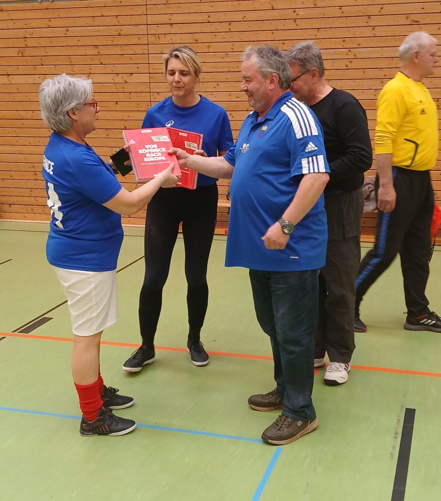 Ganz großer Auftritt: „Tino“! Der Ehrenamtler des Tages. Gefühlt hat er alles gemacht, Vom Aufbau bis Abbau, Schiedsgericht, Soundmaster, Fotograf, Schiedser und Wirt… mehr geht nicht. Ein dreifach donnerndes „Tino, er lebe hoch, hoch, hoch. — Auftritt Rainer! Unser Lieblingsbäckermeister, wie wir ihn kennen. Erst packt er das Füllhorn seiner Brot- und Gebäckwaren aus und dann feiert er kräftigst mit. Das tat auch Peter, Lebensfroh und Unverwüstlich tragen seinen Namen. Aber auch Auftritt von Oliver Igel, der uns keineswegs nur als Amtsträger sondern auch als Fan beehrte.—- Auftritt auch einiger toller Fans aus der Kurve, die über den ganzen Tag lautstarken Support von den Rängen lieferten. „Allez les bleus“ hieß das Motto und gerne hätten wir nochmal die Marseillaise gehört. — Viel zu früher Abtritt der Kölner Damen, die ihre Ehrung wegen ihrer langen Rückreise vorgezogen erhielten, leider ohne den großen ihnen gebührenden Applaus, den sie zuvor jedoch bei jeder gelungenen Aktion am Ball reichlich gespendet bekamen.
