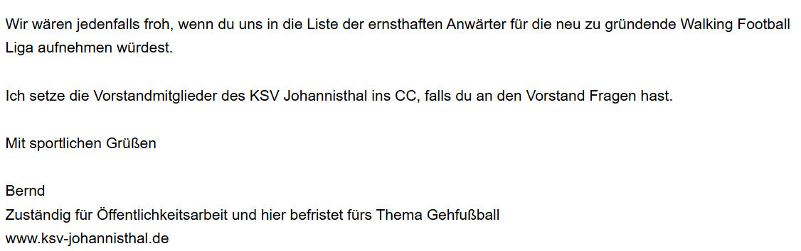 Und es gab Erstaunliches zu vernehmen. Detlef Kahmann, seines Zeichens Verantwortlicher für Gehfußball beim TSV Mariendorf, kann angeblich bundesweit auf eine Adressliste von mehr als 700 Walking Football Teams zurückgreifen. Nun will er auch den Kleinen Sportverein Johannisthal 1980 e.V. einschleifen und wer weiß, vielleicht ereilt uns auch mal eine heißbegehrte Einladung zum Super Cup des Walking Footballs in Mariendorf!?
