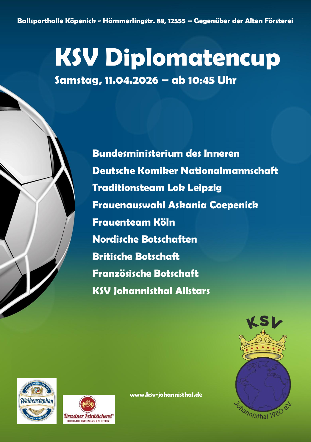 Und während in naher Ferne der KSV Einstieg in den Gehfußball (30.04., Test gegen die Kaulsdorfer Gehfußballer) winkt, erscheint schon baldigst der KSV Diplomatencup am Horizont (11.04.), der zugleich auch Testlauf für den Vatikan Cup ist, welcher Anfang Juni in Rom in seine dritte Auflage geht.