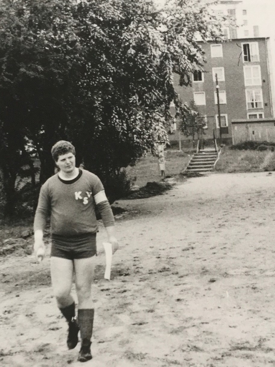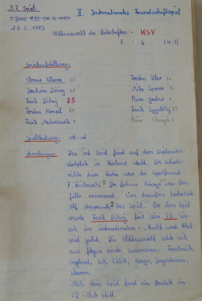 Und hier als Schmankerl noch etwas für die historisch Interessierten, als Beleg für die seeeehr lange Geschichte des KSV mit diplomatischen Vertretungen. Im Mai 1983, im erst siebenundreißigsten Spiel der KSV Historie heißt der Gegner „Weltauswahl der Botschaften“, olala! — Der blutjunge Elmar tritt später bei einem Festbankett mit Botschaftsleuten ans Mikro und nimmt sich die Freiheit im Namen der Deutschen Demokratischen Republik zu sprechen: „Ihr Völker dieser Welt, schaut auf diesen Verein …!“ oder so ähnlich. Im Bild der forsche Elmar, verschmitzt mit seinem Redemanuskript, welches allein wohl schon für drei Jahre Bautzen reichte, wenn es da nicht schon die zarten Bande des KSV mit der Tschechischen und Russischen Botschaft und deren Protektion gegeben hätte