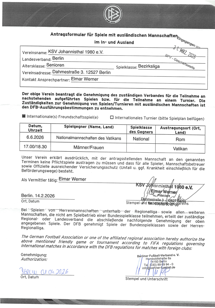 Wir steuern mal wieder auf ein ‚Länderspiel‘ zu. Also Bedarf es hochamtlicher Genehmigungen, sprich Post vom Berliner Verband, respektive DFB.